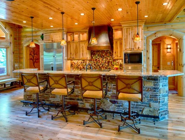 آشپزخانه روستیک با نمای سنگ و چوب + تصاویر
