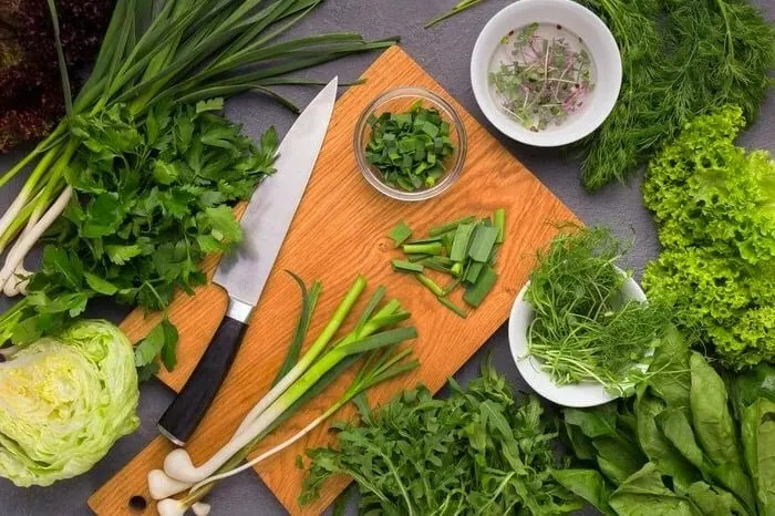 سبزیها را نیز پاک کرده و بشویید. پس از آنکه آب سبزیها خشک شد، آنها را خرد کنید.