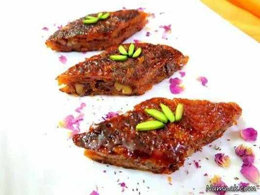 گردو ، پودر قند و دارچین را با هم مخلوط کرده و روی خاگینه هویج بریزید، سپس رول کرده و شیره را روی آن بریزید.