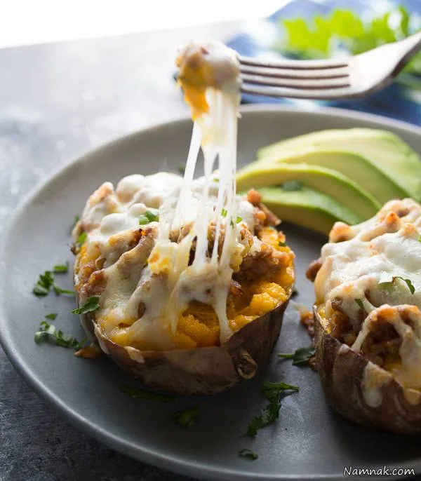 بعد از اینکه سیب زمینی ها پخت از وسط آن را نصف کنید و مقداری از گوشت داخل آن را با قاشق خالی کنید. بعد با سبزیجات تفت داده شده داخل سیب زمینی ها را پر کنید.