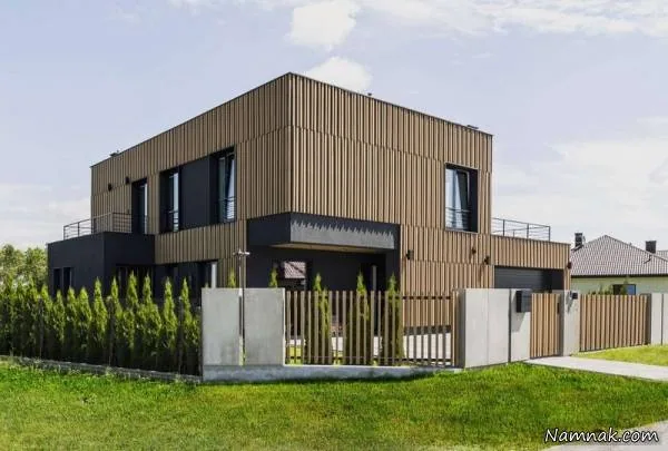 نمای ساختمان با گچ سیاه و کامپوزیت چوب مانند طراحی شده است و در داخل خانه ، نرده های راه پله از زمین تا سقف است که هیچ مشکی ندارند و بسیار زیبا هستند و می توانند یک طرح 3 بعدی باشند .