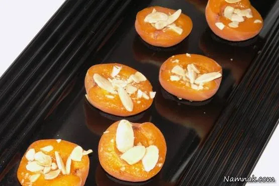 زرد آلوها را به مدت 12 دقیقه و با حرارت 200 درجه سانتی گراد داخل فر بپزید.زمانی که زردآلوها پخته شد آن را از فر خارج کرده و در ظرف پذیرایی بچینید .