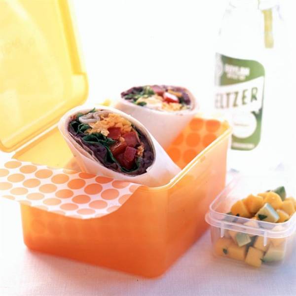 نان را به شکل استوانه ای بپیچید و در کاغذ مومی آشپزخانه بگذارید و دو طرف آن را ببندید. لقمه ها را از وسط برش بزنید و با سالاد انبه سرو کنید.