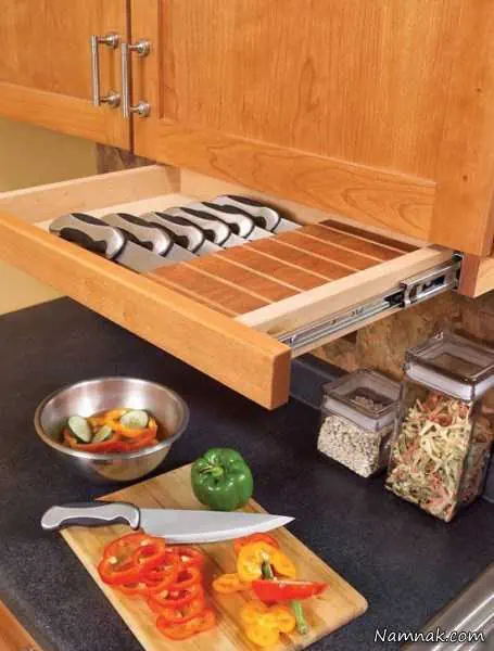 چیدمان حرفه ای داخل کابینت آشپزخانه