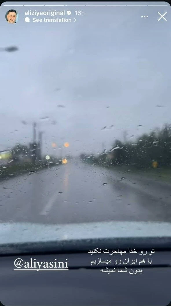 علی ضیا مجری برنامه با ضیا که در جدیدترین قسمت این برنامه با مریم حیدرزاده به گپ و گفت نشسته است، در یک استوری افراد متمایل به مهاجرت از ایران را مخاطب قرار داد و نوشت:
