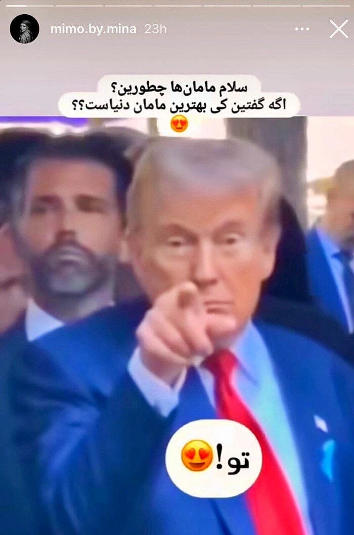 استوری جدید مینا مختاری، اینفلوئنسر معروف و همسر بهرام رادان شوخی جالبی با عکس ترامپ در فضای مجازی منتشر کرد.