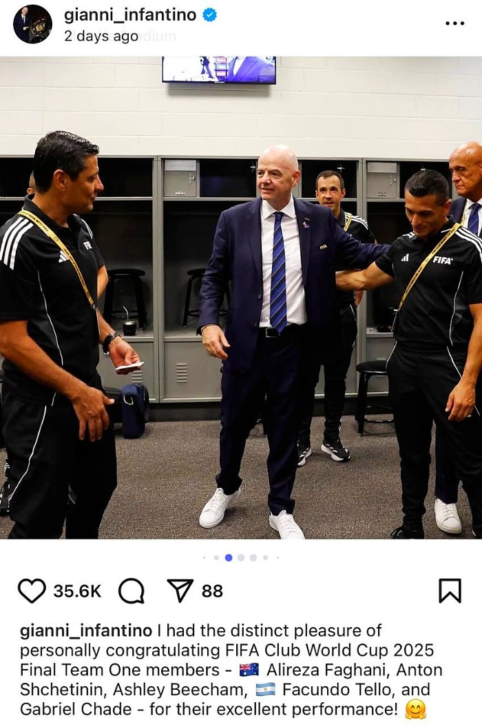 جانی اینفانتینو با انتشار عکسی در کنار علیرضا فغانی و دیگر داوران فینال جام باشگاههای جهان ۲۰۲۵ نوشت: