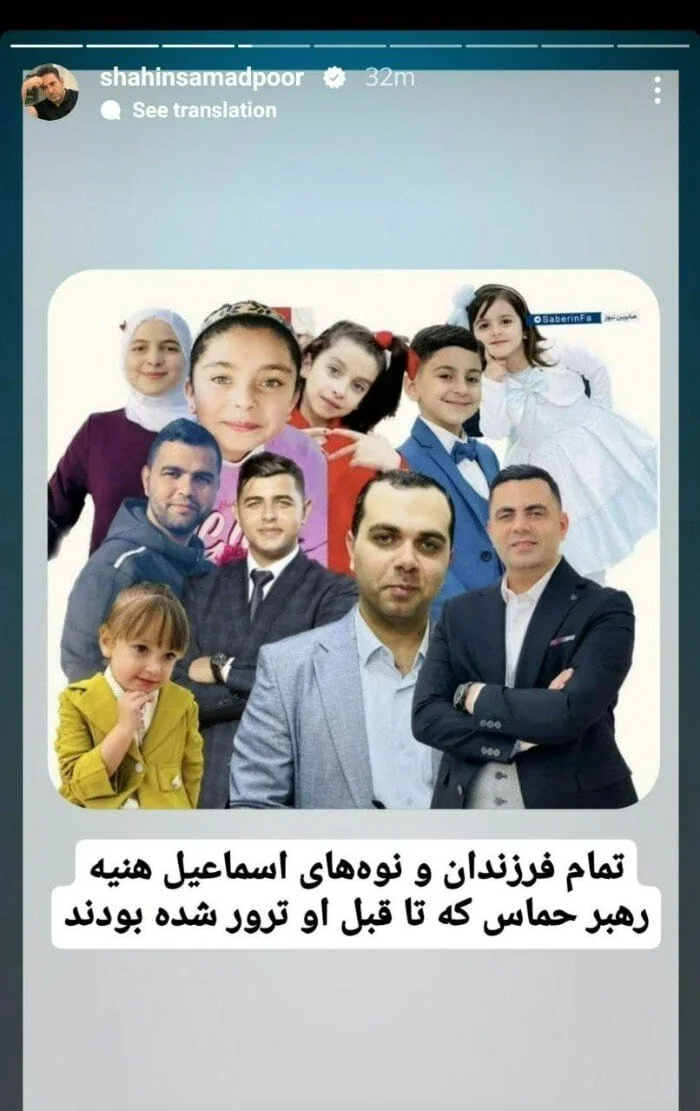 شاهین صمد پور در واکنش به شهادت هنیه در تهران، در استوری جدید خود تصاویر این اعضای خانواده اسماعیل هنیه را منتشر کرد.
