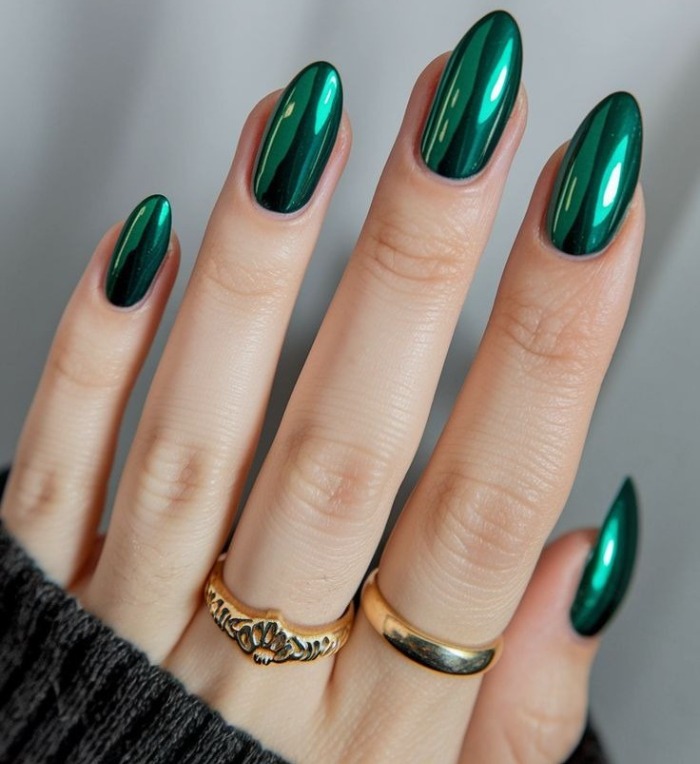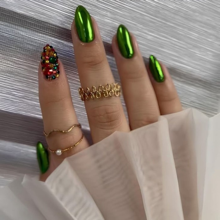 انواع لاک کروم بسیار متنوع هستند؛ از کروم نقرهای کلاسیک و کروم طلایی گرم گرفته تا کروم رزگلد و مسی گرم. این تنوع میتواند تفاوت چشمگیری در زیبایی و هماهنگی استایل شما ایجاد کند. همچنین، در طراحیهای لاک کروم جواهری، رنگهایی مانند طلایی، نقرهای، رزگلد، آبی متالیک و سبز زمردی از محبوبترین گزینهها هستند که شما میتوانید برای زیباتر کردن ناخنهای خود انتخاب نمایید.در ادامه این بخش از نمناک تصاویری از انواع لاک کروم جواهری را منتشر کرده ایم.