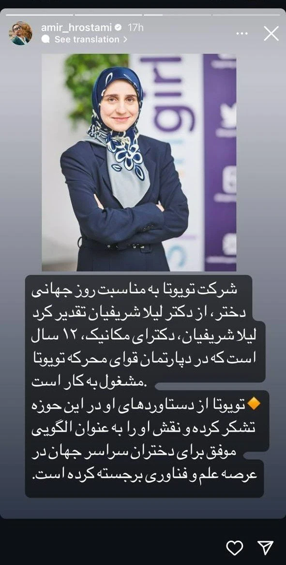 شرکت تویوتا به مناسبت روز جهانی دختر، از دکتر لیلا شریفیان تقدیر کرد. لیلا شریفیان، دکترای مکانیک،12 سال است که در دپارتمان قوای محرک تویوتا مشغول به کار است.