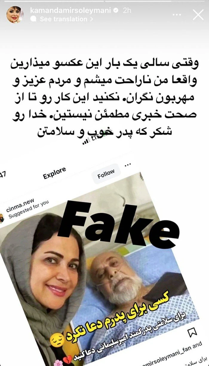 کمند امیرسلیمانی بازیگر سینما و تلویزیون و دختر سعید امیرسلیمانی با انتشار عکسی از پدرش که در فضای مجازی وایرال شده، خبر از سلامت پدرش داد و نوشت:
