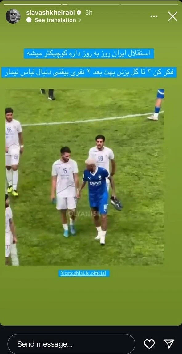 دوشنبه شب تیم فوتبال استقلال در چارچوب هفته چهارم لیگ نخبگان آسیا به مصاف الهلال عربستان رفت و با نتیجه 3 بر صفر شکست خورد. در دیدار الهلال و استقلال، نیمار در زمان خروج از زمین در محاصرۀ ۲ بازیکن جوان استقلال قرار گرفت.