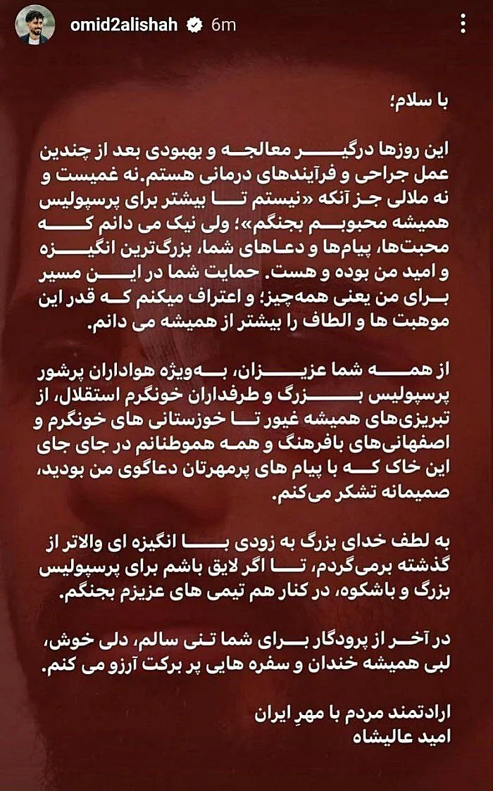 این روزها درگیر معالجه و بهبودی بعد از چندین عمل جراحی و فرآیندهای درمانی هستم. نه غمیست و نه ملالی جز آنکه "نیستم تا بیشتر برای پرسپولیس همیشه محبوبم بجنگم"؛ ولی نیک میدانم که محبت ها، پیام ها و دعاهای شما، بزرگ ترین انگیزه و امید من بوده و هست. حمایت شما در این مسیر برای من یعنی همه چیز؛ و اعتراف میکنم که قدر این موهبت ها و الطاف را بیشتر از همیشه می دانم.