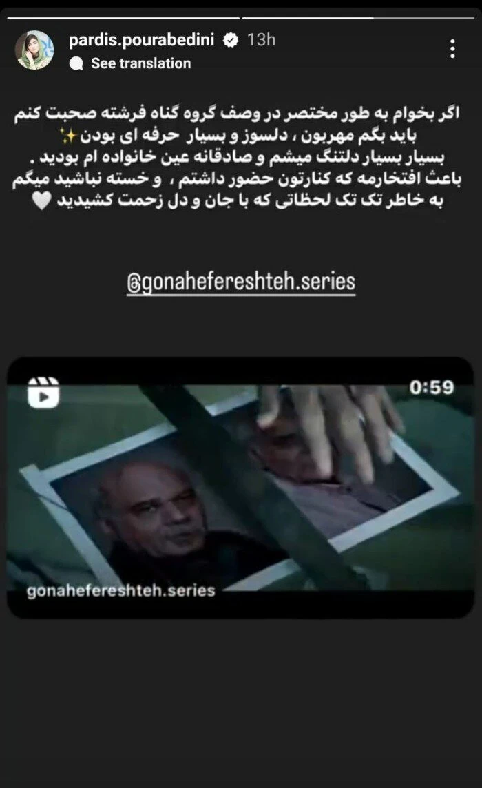پست جدید پردیس پورعابدینی درباره سریال گناه فرشته