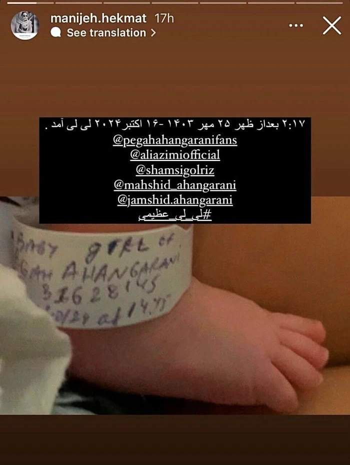 پگاه اهنگرانی مادر شد؛ منیژه حکمت نوه ای را استوری کرد