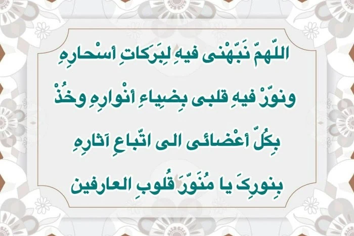 «اللّهمّ نَبّهْنی فیهِ لِبَرَکاتِ أسْحارِهِ ونوّرْ فیهِ قلبی بِضِیاءِ أنْوارِهِ وخُذْ بِکُلّ أعْضائی الی اتّباعِ آثارِهِ بِنورِکَ یا مُنَوّرَ قُلوبِ العارفین.»