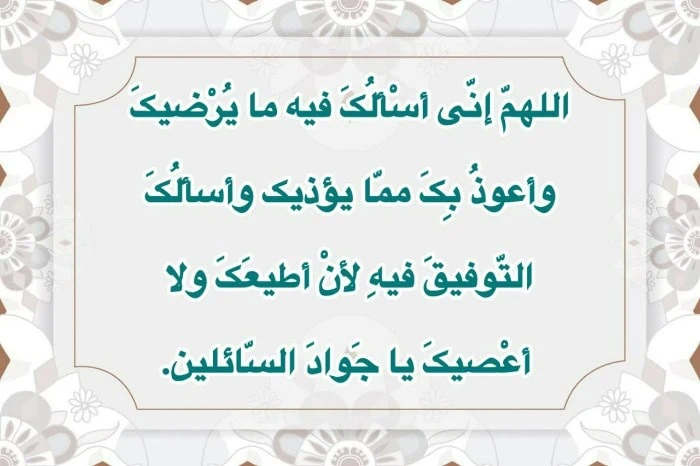 اللهمّ إنّی أسْألُکَ فیه ما یُرْضیکَ وأعوذُ بِکَ ممّا یؤذیک وأسألُکَ التّوفیقَ فیهِ لأنْ أطیعَکَ ولا أعْصیکَ یا جَوادَ السّائلین.