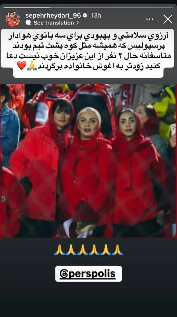 سپهر حیدری پیشکسوت باشگاه پرسپولیس با قرار دادن عکسی از بانوان هوادار این باشگاه در صفحه اش نوشت: