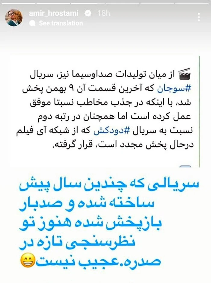 استوری امیر حسین رستمی در واکنش به بازدید بالای سریال دودکش