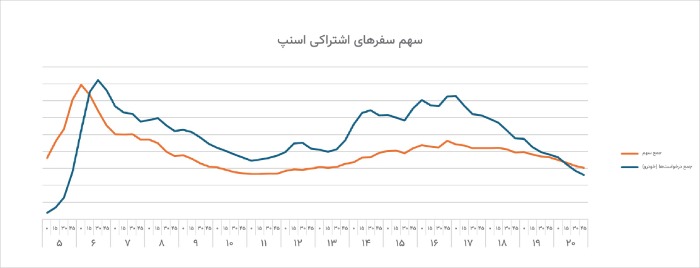 نمودار تجمیعی سهم سفرهای اشتراکی و تعداد کل سفرهای روزانه پایتخت با ناوگان اسنپ