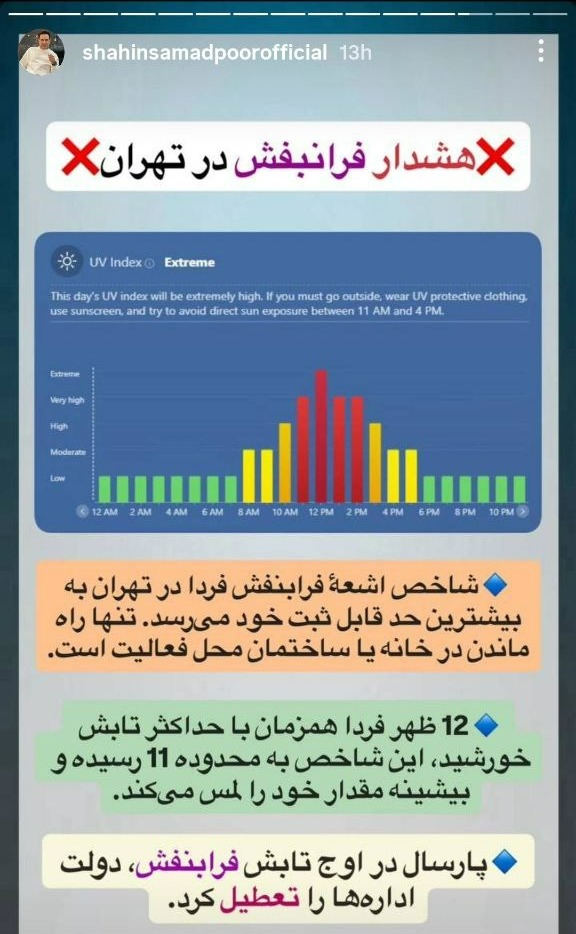 امروز شاخص اشعه فرابنفش (UV) در تهران به اوج خود میرسد، بنابراین بهترین کار ماندن در خانه یا محل کار است. به ویژه در ساعت ۱۲ ظهر که تابش خورشید به حداکثر میرسد، این شاخص به عدد ۱۱ میرسد که بیشترین میزان ثبت شده است.