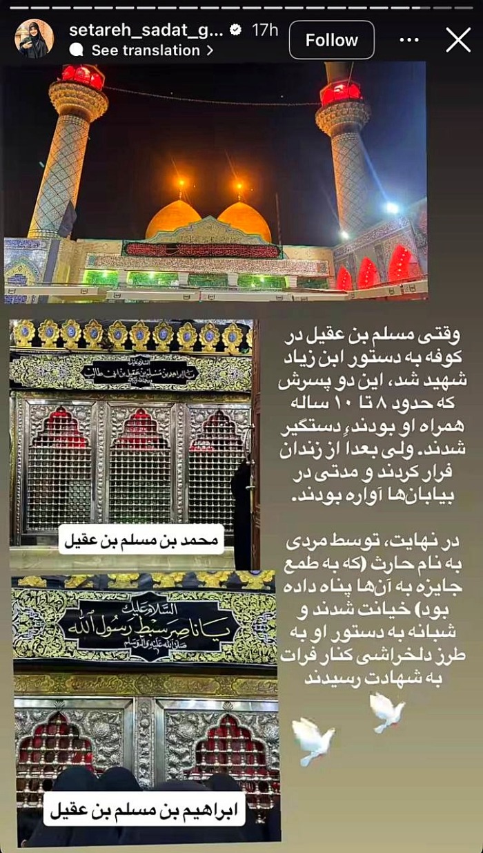 بازیگر سریال گاندو در یکی از استوریهایش، تصویری از مقبره دو طفلان مسلم بن عقیل (ع) به اشتراک گذاشت و درباره نحوه شهادتشان نوشت: