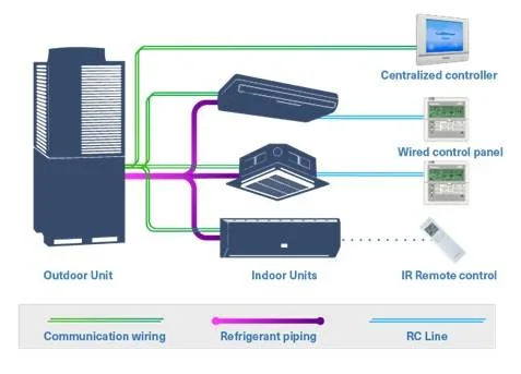 سیستم 2 لوله VRF با تهیه مبرد از طریق لوله ها به صورت مایع ، قسمت هایی را که به آن نیاز دارند ، خنک می کند. در مقابل، مناطقی که نیاز به گرمایش دارند از طریق لوله های مبرد به صورت گازی با مبرد فراهم می شوند.