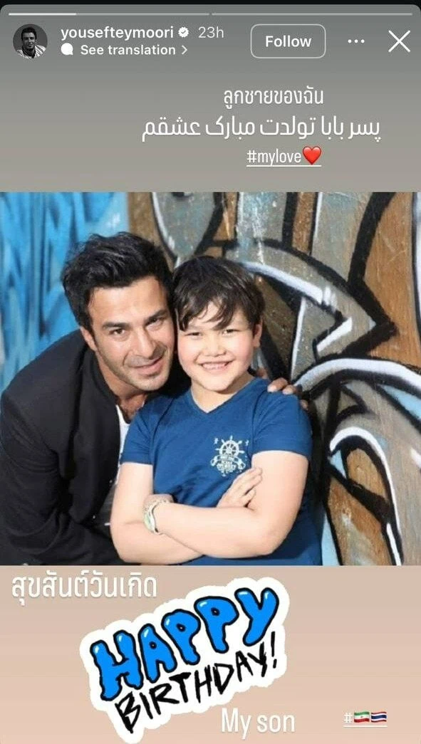 یوسف تیموری بازیگر طناز سینما و تلویزیون با انتشار عکسی در اینستاگرام خود تولد پسرش آرمین را تبریک گفت. استوری جدید آقای بازیگر برای برخی از کاربران از این حیث معنادار تلقی شد که یوسف با وجود نداشتن نسبت خونی با این پسر تایلندی همچنان او را در روز تولدش یاد کرده و عشق و علاقه را به زلال ترین شکل ممکن ابراز میکند و این یعنی همان معنای محبت بی چون و چرا نسبت به یک انسان. آرمین پسر خوانده یوسف تیموری محسوب می شود و در تایلند زندگی می کند.